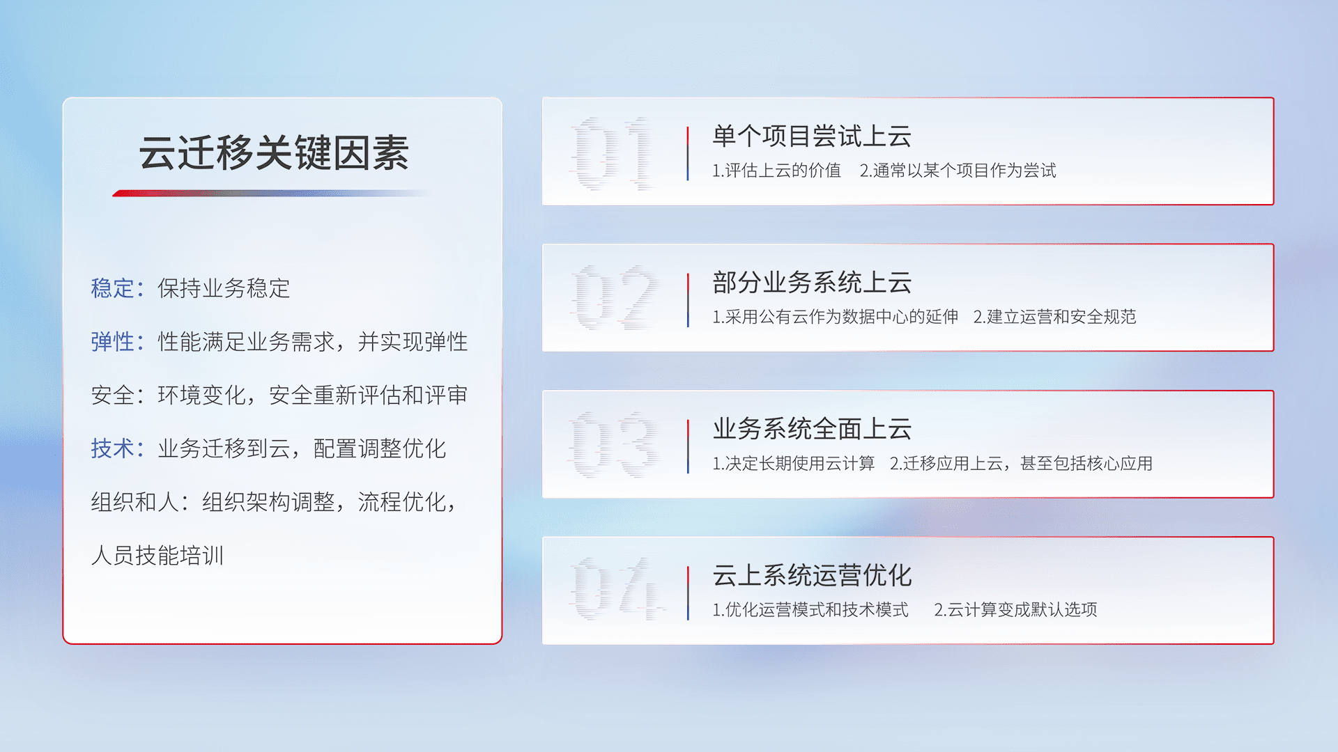 结合实际业务,,,,从规划设计、、云平台选型、、、云原生改造、、数据迁移、、、、集成交付,,迁移全过程为客户识别最佳上云路径,,,,做好风险识别管理,,,设计网络架构、、、、身份权限、、、安全审计合规、、、操作审计、、、、日志审计、、、监控告警策略、、多站点容灾设计等,,对云上基础设施进行整体规划,,,,提升IT治理水平,,以满足弹性、、、、高可用、、高性能的需求。。。。