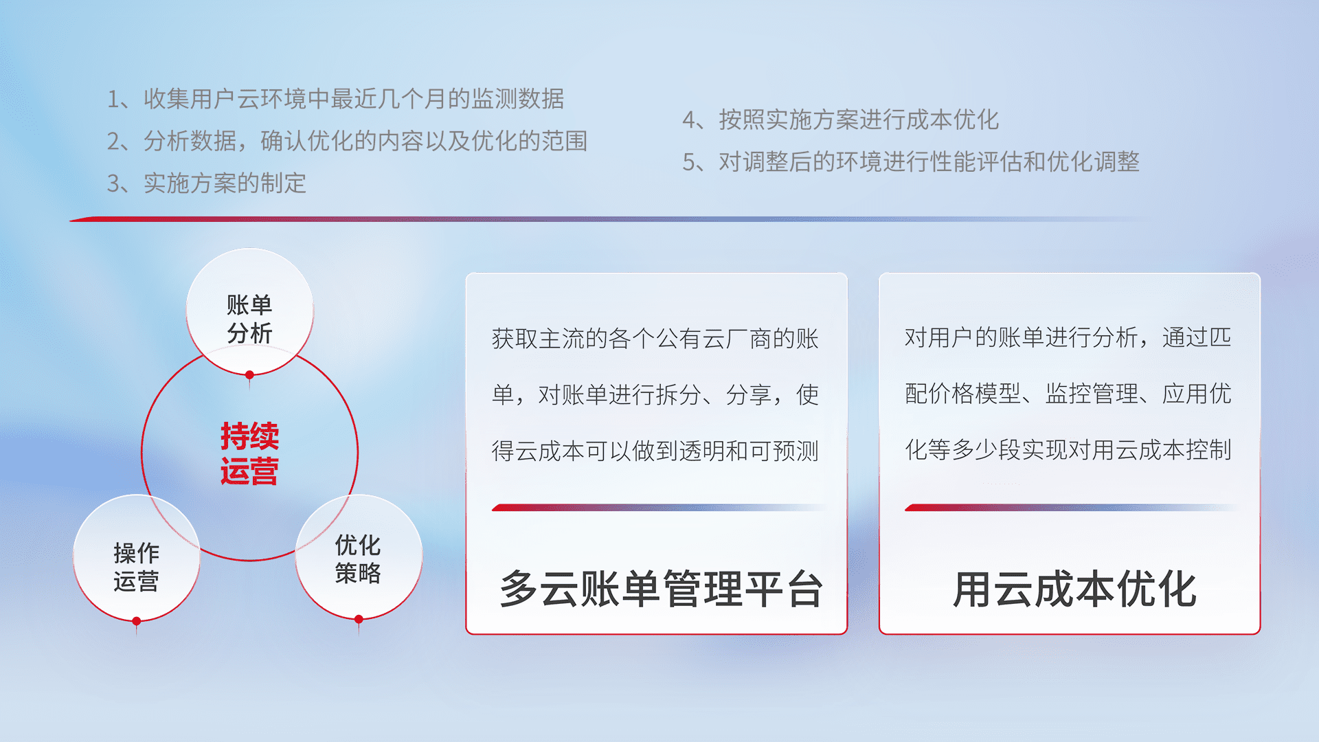 通过多云纳管,,以统一的资源数据模型把客户的云资源进行抽象和封装,,,进而实现对多云资源的统一操作,,,,保障云资源管理的可靠性、、、稳定性与可用性。。量身定制化运维内容,,,,配置、、、、开发运维、、、补丁管理、、备份、、、监控、、认证和访问管理、、、审计和日常巡检等,,保障在用云过程中的可靠度,,,,稳定度以及高可用率。。